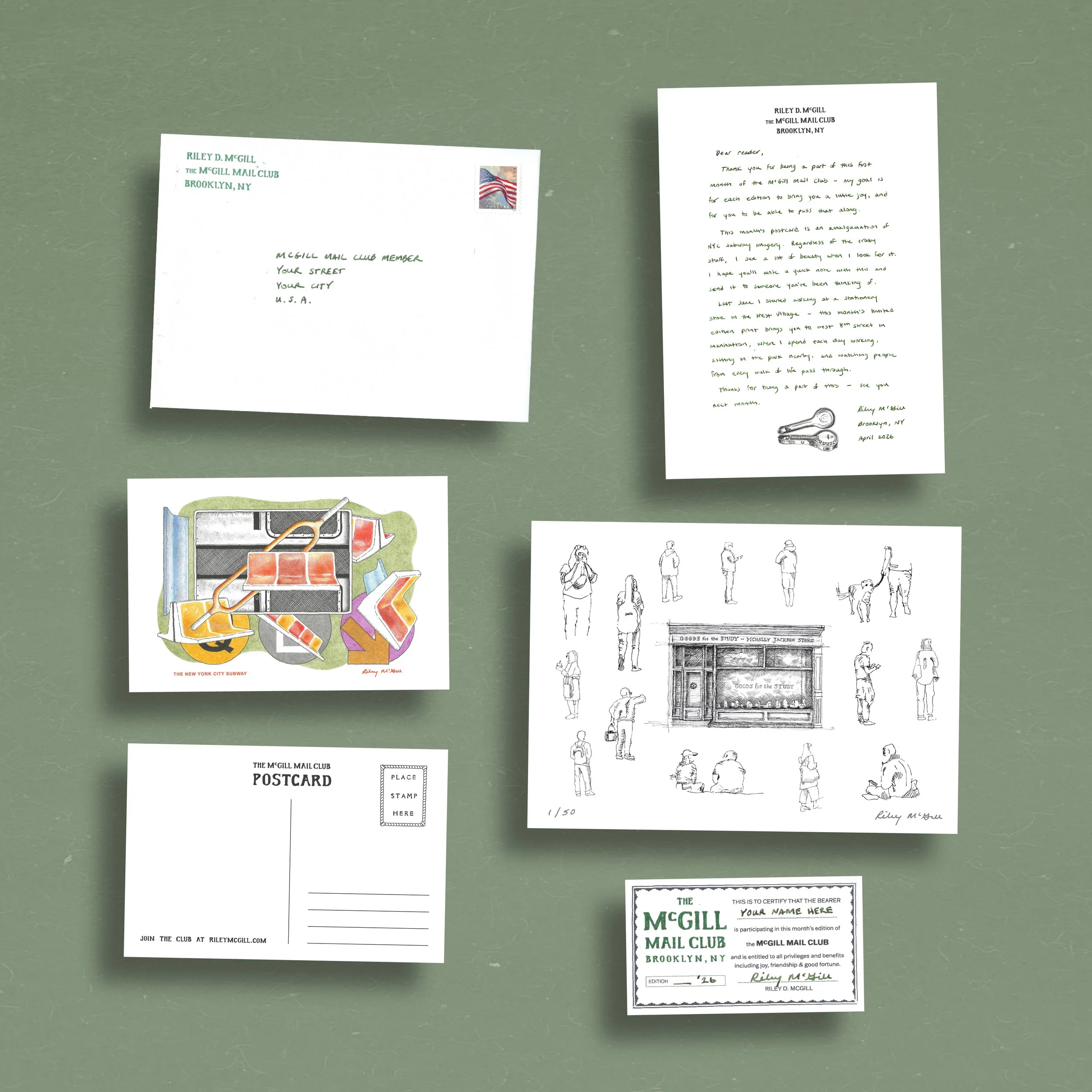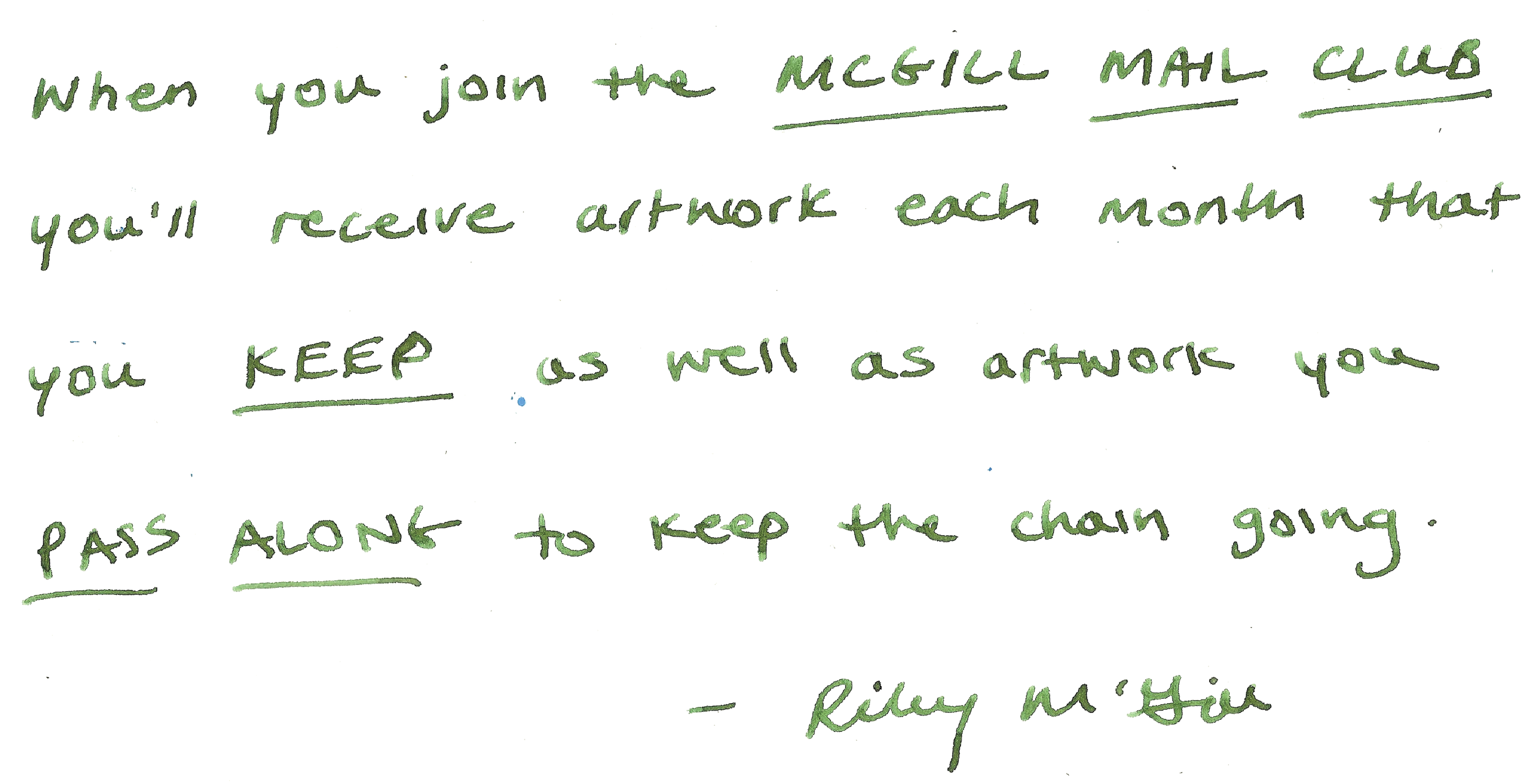 The McGill Mail Club is a monthly club where you receive artwork each month to keep, as well as artwork to pass along - which keeps the chain going.